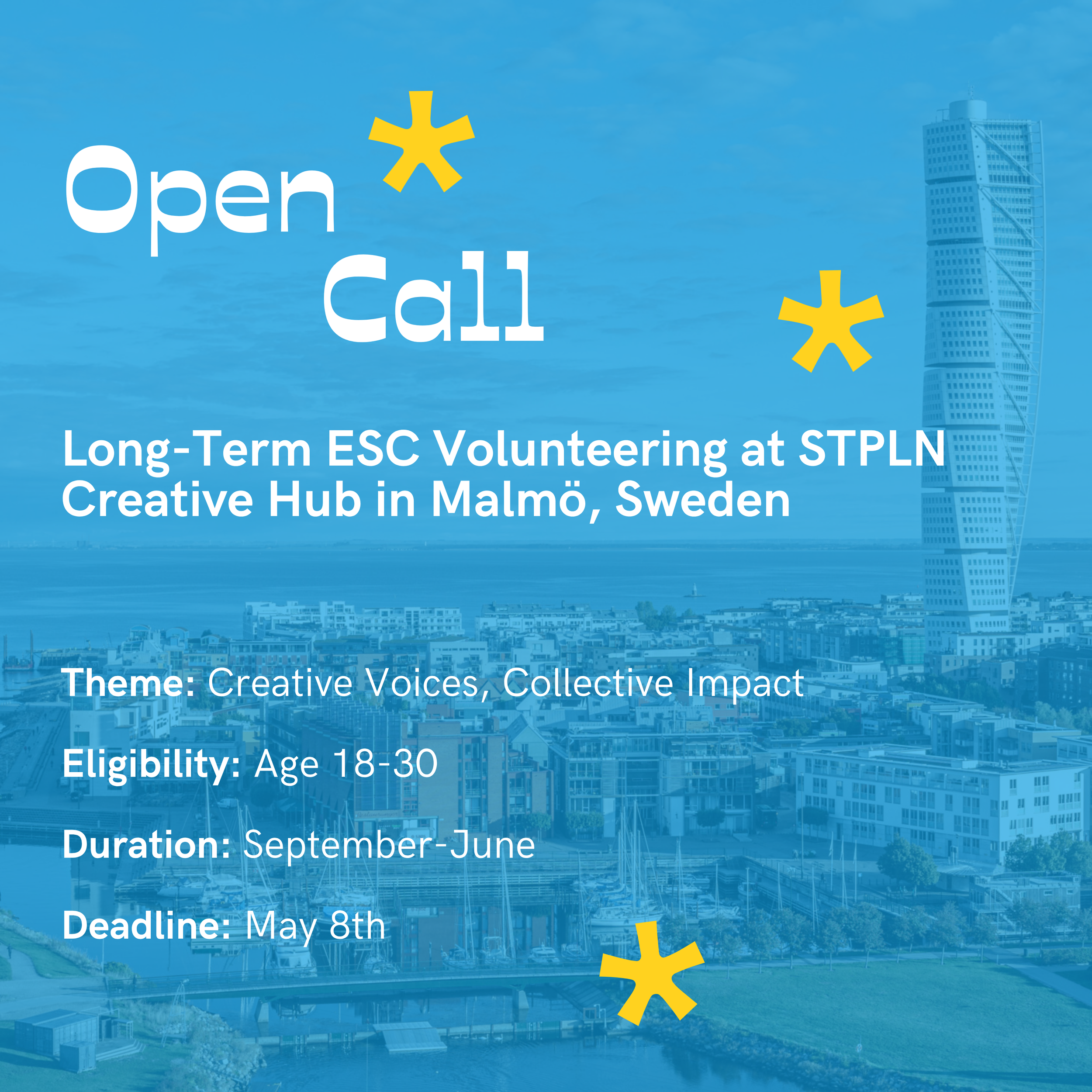The Creative Voices, Collective Impact is a 10-month ESC project (September 2026 – June 2027) hosted by STPLN in Malmö, Sweden. This project invites three young creatives from across Europe to form an interdisciplinary communications team exploring how storytelling, media, and creative communication can strengthen communities and social initiatives.